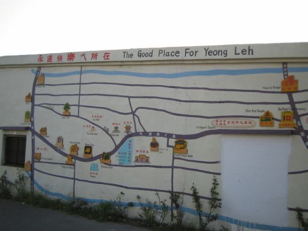 現在的時間已經是下午四點多了,經過了幾番波折,也不斷的向路人詢問,最後還是順利找到了「永樂社區」。一進到社區裡頭,牆上的壁畫是社區的地圖,牆壁的上頭也告訴所有到訪的人,這裡是個「永遠快樂ㄟ所在」。
