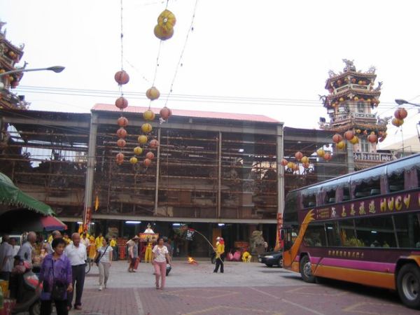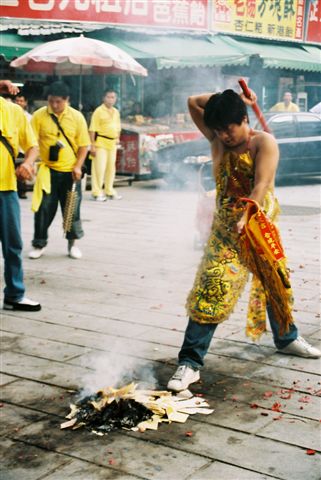 奉天宮的外牆用網子罩住,看似正在進行外牆的整修。今天恰好有從台北來的進香團,有迎神的儀式。前面幾個打頭陣乩童,拿著郎牙棒、流星垂,不停的往自己的背上打,血不停的流,感覺很痛的樣子,不過這些乩童有著「神明護體」,「應該」沒有什麼大礙吧?!很少有機會看到這樣的風俗,感覺上還蠻新鮮的。