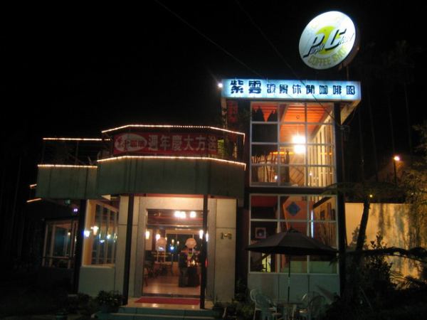 來到了「紫雲景觀休閒咖啡園」,就這麼剛好也是「番路」的微笑商店,坐在屋頂的露天座椅,遠眺山腳下,除了黑鴉鴉的一片,還有一層薄霧,沒有辦法能夠看得到夜景,有點小失望。