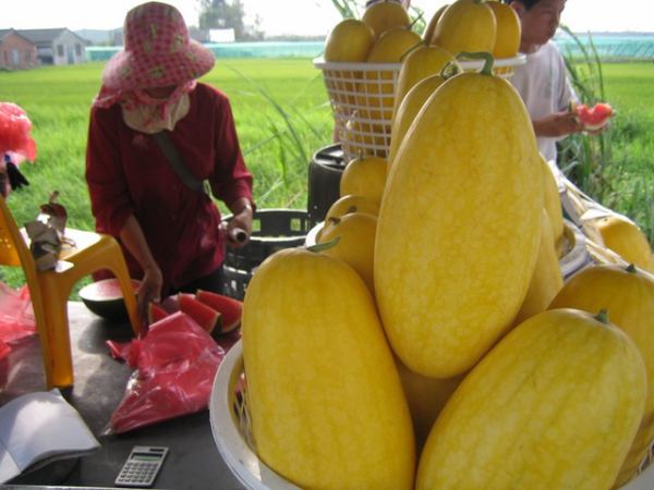 在往西螺的路上,看到很多的攤販車上賣著金黃色的「黛安納香瓜」,看起來很香甜可口,但是老闆卻在此時潑了我們一盆冷水,說要放兩天之後才可以吃。不過老闆卻強力主打他的另一項產品-「無籽西瓜」,說真的,看起來真的不怎麼樣,不過老闆的三寸不爛之舌還是成功的說服我們花錢,真的吃起來不是很甜,不過總覺得有種被騙的感覺。