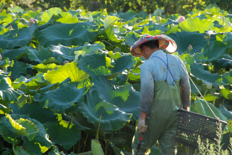 也發現還是沒有開花,就隨口問了正在採蓮子的大哥