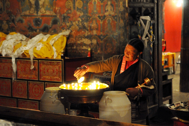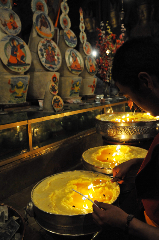 僧人會幫忙民眾將酥油添加到器皿內,讓代表祝福的火苗能夠不斷的燃燒、延續。