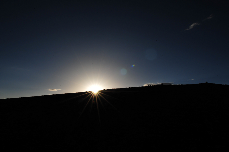 凌晨兩點多從夢中醒來,出發前先到定日的檢查口登記資料,接著搭著車,在黑暗中搖搖晃晃的到遮古拉山口看日出,這裡的海拔高於5100米,實際高度不詳。耐著日出前的低溫到車外拍照,即使穿上了所有的保暖衣物,還是可以會有冷的感覺,連按快門的食指都變得有些遲鈍。我們也在等待日出之際,煮了咖啡,也吃了點甜食,增加身體的熱量,啜飲了一口三合一的咖啡,身體也著實暖活不少,這也是我第一次在這麼高海拔的地方喝著咖啡,也是一種很特別的經驗。