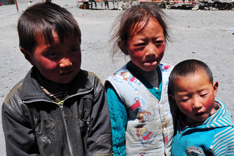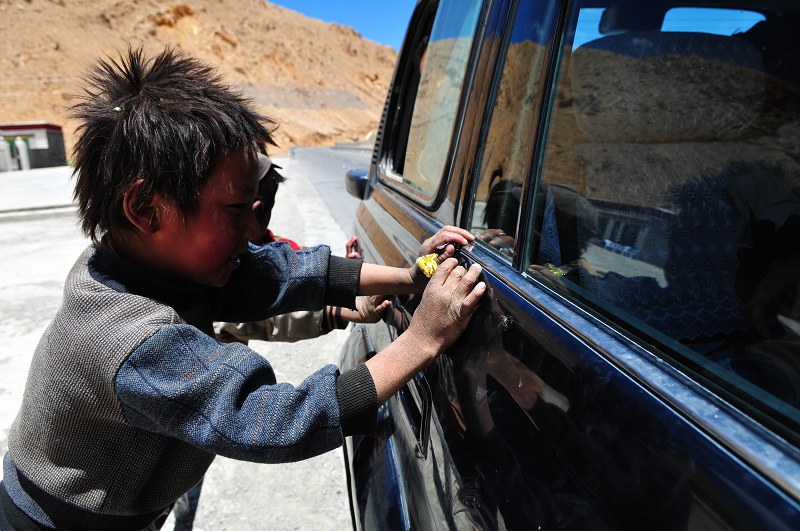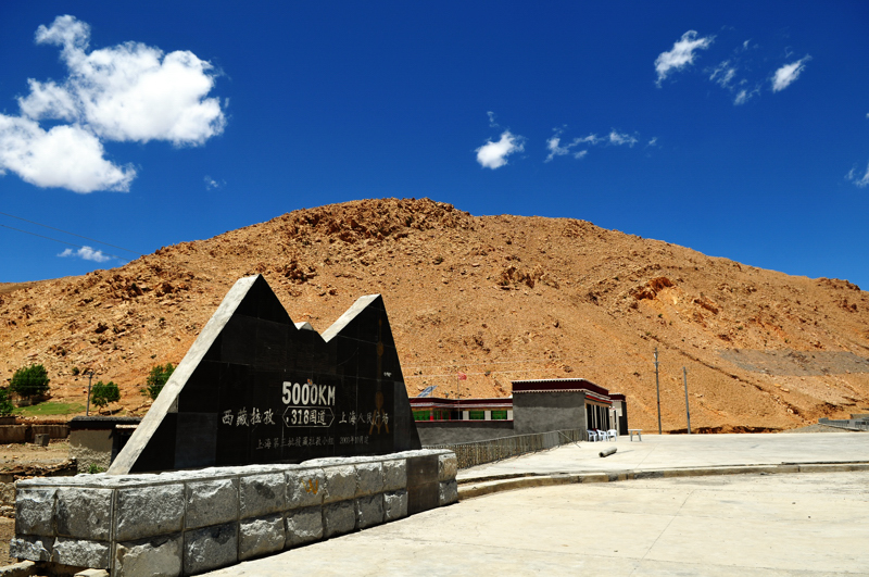 離開日喀則市區,車子疾馳在筆直的318國道上,安靜的沒有聲音,一路上天空都是無止盡的藍和朵朵的白雲。車子經過了318國道(上海-樟木)5000km處,停了下來讓我們拍照,卻又遇到了前來乞討的孩子。