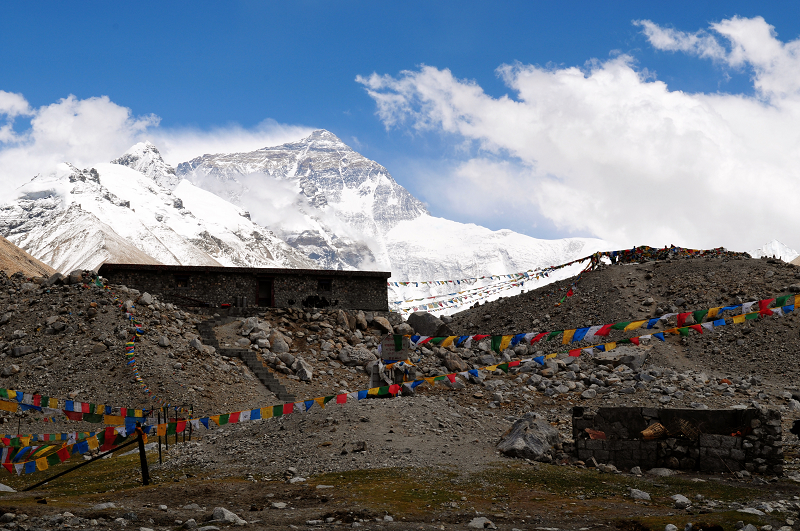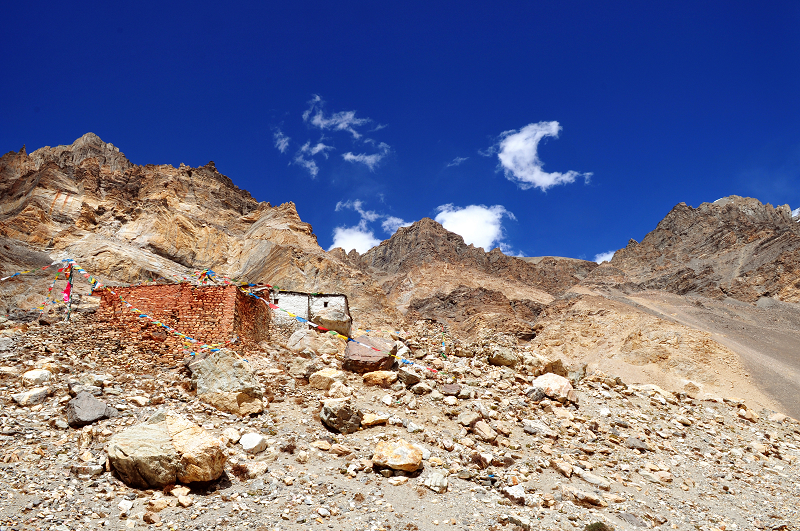 導遊扎西一路上一直問我們有沒有興趣體驗死亡的感覺,來到珠峰基地營之後,上絨布寺就在我們住的帳房不遠處。一群藏族的導遊和師傅帶著我們去爬了上絨布寺,這是一個小而精美的寺廟,規模很小。我們在岩石堆中爬上爬下,途中不時會看見被遺留下來的衣物而頭髮,原來在岩石堆中比較平坦的地方也是天葬台,也讓我們多了幾分敬畏的心。在高海拔地區這樣爬上爬下,體力消耗的速度很快,然而對於藏族的導遊和師傅來說,可以在岩石堆中跑上跑下,就不難想像雪巴人可以背著兩百公斤的水管在高山上行走的樣子,而我們總是氣喘吁吁的跟在後頭。