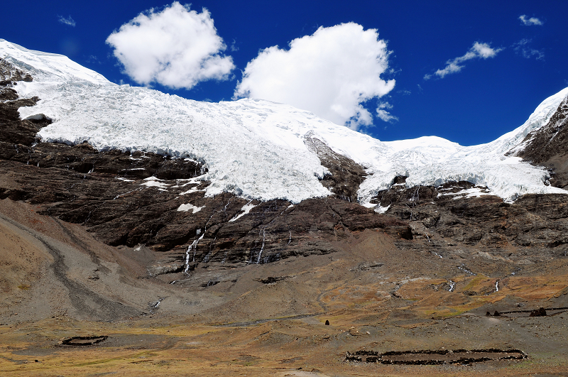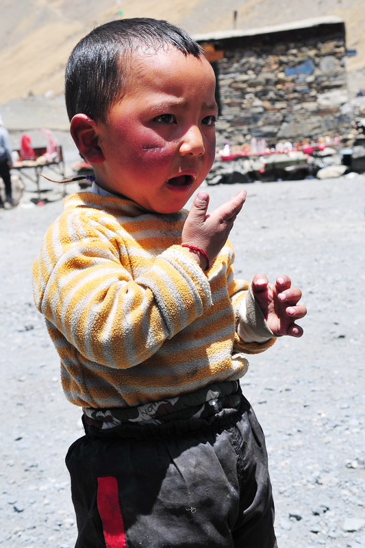 山頂上覆蓋了一層厚厚的冰雪,這是壯闊的卡若拉冰川,這事再西藏看到的第二個個冰川,終年不化,而在藍天下更襯得出大自然的奧妙。而這也是到日喀則的途中必停的景點,因此也聚集了很多小販,主要販賣玉石和藏式的飾品,然而每每有旅遊車停下來,就會有小朋友跑上前來開始伸手要東西,這似乎已經是種習慣,也是種可以取得食物的方式,我們並沒有給錢,而是打開一包糖果準備要發給這些小朋友,沒想到才一打開袋子,糖果就瞬間被搶光了,這是一種存在西藏普遍的現況。在物資相對缺乏的條件下,每個小朋友必須要學會自己謀生的方式,哪怕只是搶到一顆糖果或是要到一毛錢,都是必然的收穫。