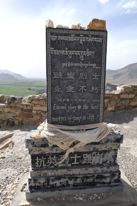而宗山古堡本身則是有很重要的戰略地位,在19世紀英軍入侵西藏,最後攻入宗山古堡,西藏軍民為了不願屈服而選擇跳崖殉身。站在抗英烈士跳崖處,寧靜的有種詭譎的氣憤,風聲中猶如有戰爭的廝殺聲,往下看去,是一處高聳的黃土坡,很難想像往下跳是需要多大的勇氣。