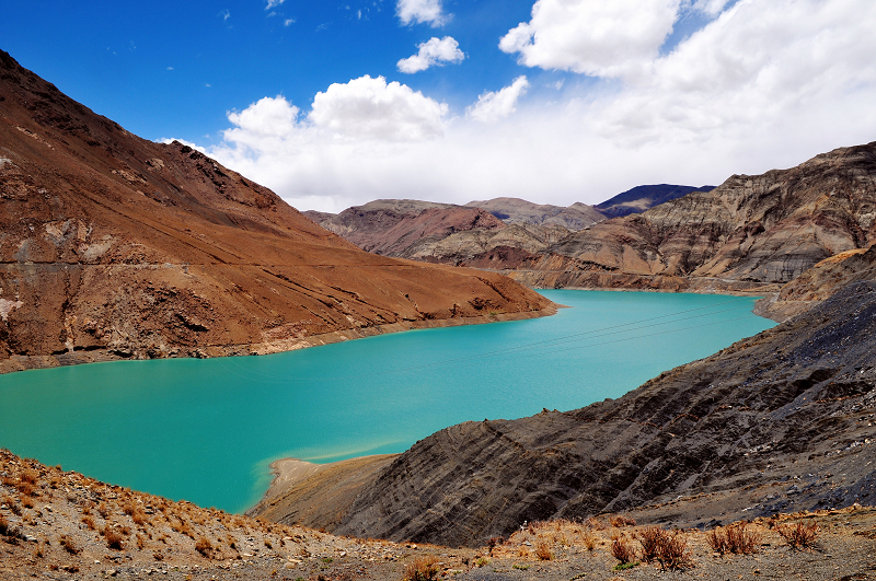 在卡若拉冰川旁的滿拉水庫,翠綠的顏色猶如置身在山中的綠寶石一般。