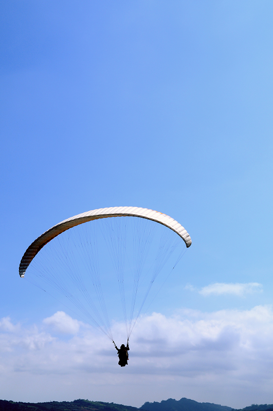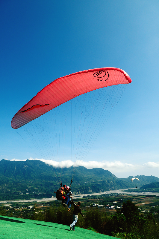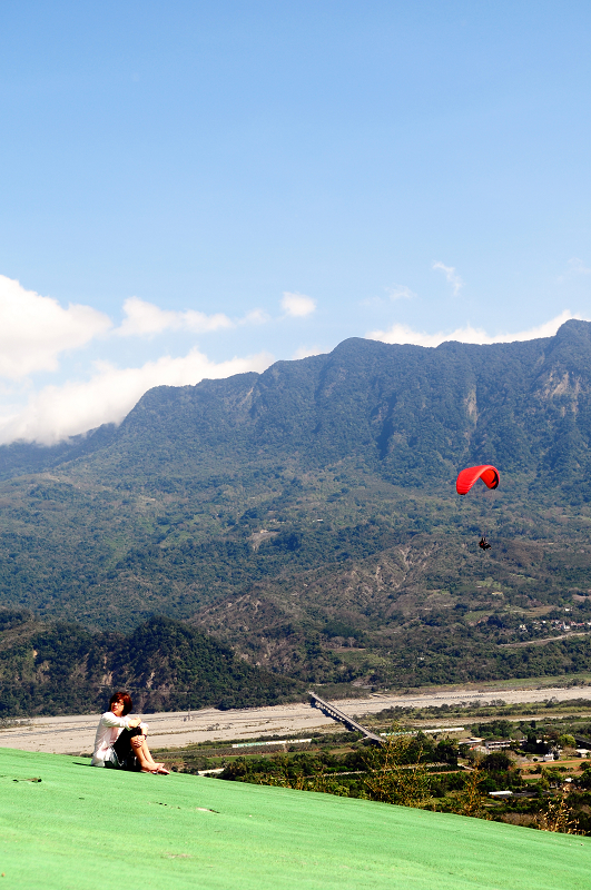 1、2、3...瞬間離開了地面,尖叫聲也伴隨著飛行的人此起彼落。飛行傘在藍天下,彷彿沿著遠方的海岸山脈飛行,上上下下...猶如自由自在的飛鳥,讓我想到兩年前自己的經驗,又感覺刺激了一次。