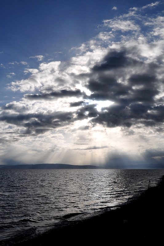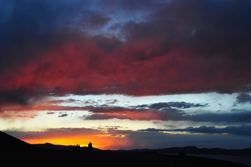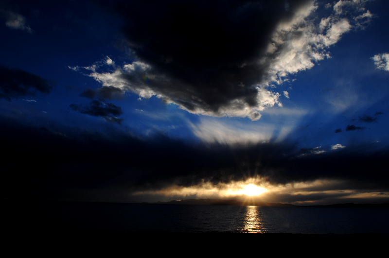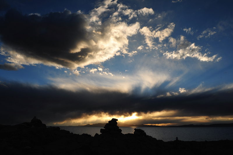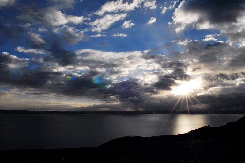 我們在清晨醒來,在低溫中踩著緩慢的步伐,用力呼吸著稀薄的空氣,登上高處迎接納木措的晨曦。而大地也一個一個依序從高到低的被太陽叫醒,而納木措那鏡面般的湖水倒映著天空的顏色,也正在緩緩的醒來。太陽光從雲層的隙縫中探出了頭,也揭開了一天的序曲。