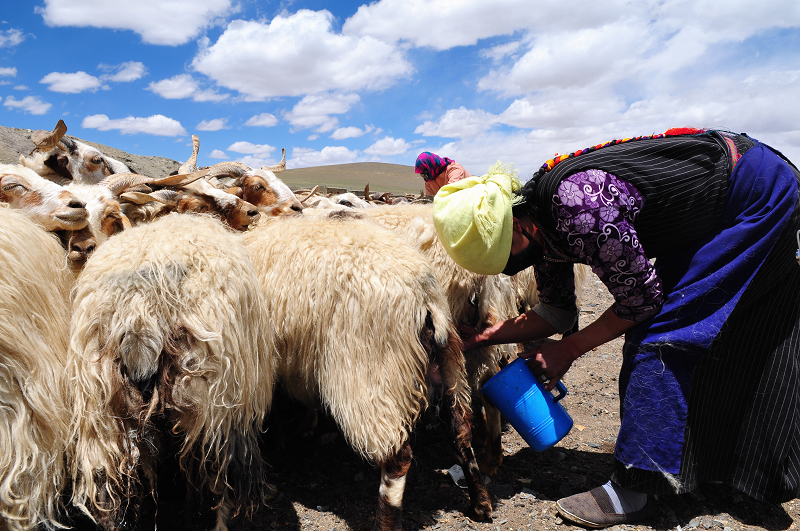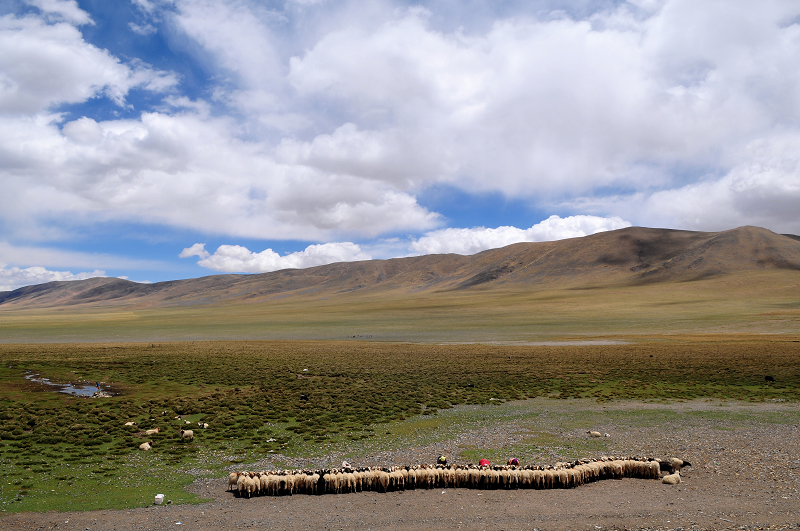 在往納木措的路上,我們被眼前的景象給吸引住。一群羊既然可以猶如軍人般排列的如此整齊,原以為羊群被施以什麼魔法,近看才知道原來這是牧民人家擠羊奶的方式。一隻又一隻的羊被迫乖乖的要等待著擠奶的過程,對羊群來說似乎也都已經習慣這樣的過程,沒有不舒服的叫聲,只有一種安靜等待到很詭異的氣氛。待所有羊都擠完奶之後,婦人將繫在羊角上的繩子一放,所有羊隻似乎都有種鬆了筋骨的感覺,安然悠閒的吃著草。